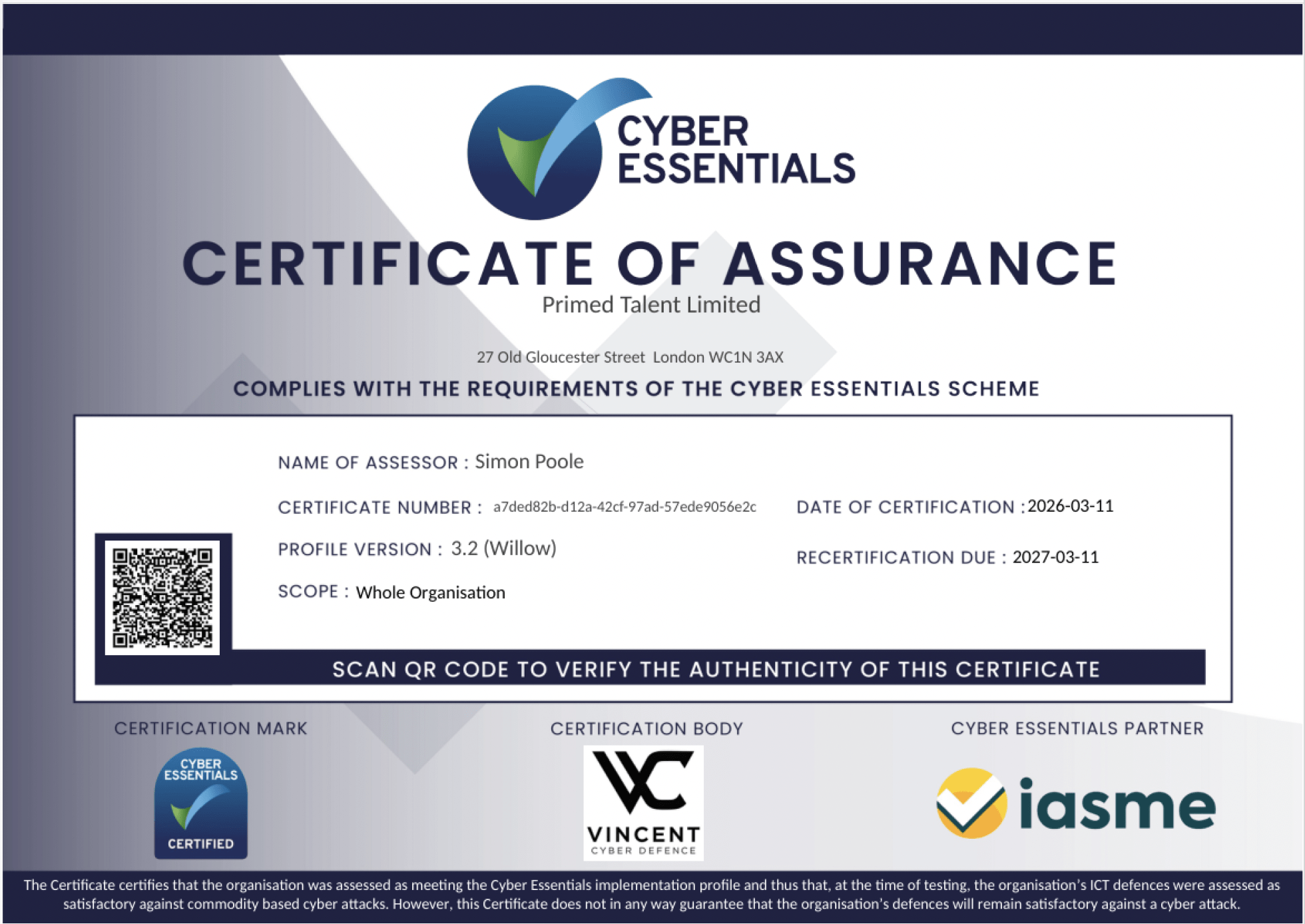 Cyber security is a core part of responsible service delivery. Primed Talent is proud to be Cyber Essentials Certified, demonstrating a clear commitment to maintaining essential cyber security controls across the organisation.